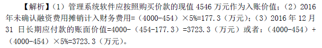 选项 A.2016年1月1日,无形资产入账价值为4 546万元 B.2016年1月1日,无形资产入账价值为5 000万元 C.2016年计入财务费用的融资费用177.3万元 D.2016年12月31日长期应付款的账面价值3 723.3万元