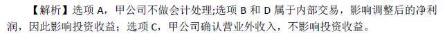 选项 A.乙公司股东大会通过发放股票股利的议案 B.甲公司将成本为50万元的产品以80万元出售给乙公司作为固定资产 C.投资时甲公司投资成本小于应享有乙公司可辨认净资产公允价值的份额 D.乙公司将账面价值200万元的专利权作价360万元出售给甲公司作为无形资产