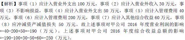 选项 A.上述事项对甲公司2016年度营业利润的影响是-190万元 B.上述事项对甲公司2016年度营业利润的影响是是-290万元 C.上述事项对甲公司2016年度综合收益总额的影响是-220万元 D.上述事项对甲公司2016年度综合收益总额的影响是-250万元