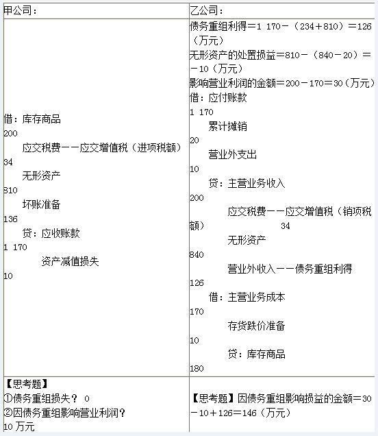 问题 甲公司和乙公司适用的增值税税率均为17%。甲公司销售一批商品给乙公司,含税价款1 170万元,乙公司到期无力支付款项,甲公司同意乙公司将其拥有的一项库存商品和一项无形资产(免交增值税)用于抵偿该债务。乙公司债务重组日抵债资料如下:(1)乙公司库存商品的账面余额180万元,已计提存货跌价准备10万元,公允价值为200万元;(2)无形资产的成本为840万元,已累计摊销20万元,公允价值为810万元。甲公司为该项应收账款计提136万元坏账准备。相关资产在债务重组前后不改变用途,假定不考虑相关税费。
