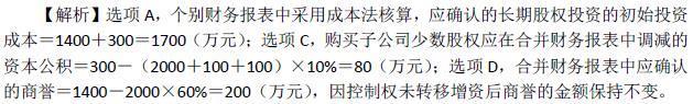 选项 A.增资后个别报表中确认的长期股权投资的初始投资成本为1700万元 B.取得乙公司10%的股权不属于企业合并 C.购买子公司少数股权在合并报表中应调减的资本公积为80万元 D.合并财务报表中列示的商誉为200万元