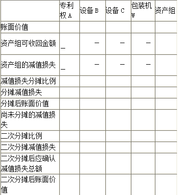 选项 A的公允价值为118万元,如将其处置,预计将发生相关费用8万元,无法独立确定其未来现金流量现值;设备B和设备C的公允价值减去处置费用后的净额以及预计未来现金流量的现值均无法确定;包装机W的公允价值为62万元,如处置预计将发生的费用为2万元,根据其预计提供包装服务的收费情况来计算,其未来现金流量现值为63万元。 ② 佳洁公司管理层根据财务预算计算得到的甲产品生产线预计未来现金流量现值为508.15万元,无法合理预计甲产品生产线公允价值减去处置费用后的净额。 (3)2009年,市场上出现了乙产品的替代产品,乙产品市价下跌,销量下降,出现减值迹象。2009年12月31日,佳洁公司对与乙产品有关资产进行减值测试。 乙产品生产线的可收回金额为800万元。设备D、设备E和商誉的账面价值分别为600万元、400万元和200万元。两项设备的可收回金额均无法可靠取得。 (4)其他有关资料: ① 佳洁公司与生产甲产品和乙产品相关的资产在2009年以前未发生减值。 ② 佳洁公司不存在可分摊至产品甲和乙生产线的总部资产和商誉价值。 ③ 本题中有关事项均具有重要性。 ④ 本题中不考虑中期报告及所得税影响。 <1>?、判断佳洁公司与生产甲产品相关的各项资产中,哪些资产构成资产组,并说明理由。 <2>?、计算包装机W在2009年12月31日的可收回金额。 <3>?、填列佳洁公司2009年12月31日与生产甲产品相关的资产组减值测试表,表中所列资产不属于资产组的,不予填列。                        资产组减值测试表      单位:万元 <4>?、计算佳洁公司2009年12月31日与生产乙产品相关的资产的减值金额。 <5>?、编制佳洁公司2009年12月31日计提资产减值准备的会计分录(设备减值金额合并列示)。