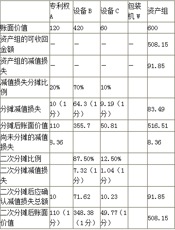 解析 专利权A、设备B以及设备C组成的生产线构成资产组。(1分)因为佳洁公司按照不同的生产线进行管理,且甲产品存在活跃市场,经包装后可对外出售。(1分) W包装机不计入该资产组。(1分)因为W包装机除用于本公司产品的包装外,还承接其他企业产品外包装,收取包装费,可独立的产生现金流量。(1分) 【考点“资产组、总部资产、商誉减值的综合处理”】 公允价值减去处置费用后的净额=62-2=60(万元),未来现金流量现值为63万元,所以W包装机的可收回金额为63万元。(2分) 【考点“资产组、总部资产、商誉减值的综合处理”】                          资产组减值测试表      单位:万元 【考点“资产组、总部资产、商誉减值的综合处理”】 不包含商誉的资产组的账面价值=600+400=1 000(万元),可收回金额为800万元,发生减值200万元。 乙产品生产线资产组的账面价值=1200(万元),可收回金额=800(万元),发生减值的金额=400(万元)。 资产组中的减值金额先冲减商誉200万元,余下的200万元分配给设备D和设备E。 设备D应承担的减值损失=200/(600+400)*600=120(万元)(1分) 设备E应承担的减值损失=200/(600+400)*400=80(万元)(1分) 【考点“资产组、总部资产、商誉减值的综合处理”】 佳洁公司2009年12月31日计提资产减值准备的会计分录为: 借:资产减值损失491.85   贷:无形资产减值准备10     固定资产减值准备(71.62+10.23+200)281.85     商誉减值准备200(2分) 【考点“资产组、总部资产、商誉减值的综合处理”】