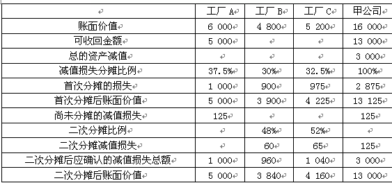 解析 (1)应该将A、B、C三家工厂作为一个资产组核算,因为A、B、C组成一个独立的产销单元,A工厂将半成品发往B、C并根据市场需求及B、C的装配能力进行分配,A工厂并不能单独产生现金流量,且B、C工厂生产设备的公允价值减去处置费用后的净额以及未来现金流量的现值无法估计,也无法合理估计A、B、C三家工厂生产设备在总体上的公允价值减去处置费用后的净额,但可以预计A、B、C三家工厂未来现金流量的现值,即只有A、B、C组合在一起能单独产生现金流量,应认定A、B、C三家工厂为一个资产组。 (2) (3) 借:资产减值损失                  3000  贷:固定资产减值准备——A工厂            1000            ——B工厂             960            ——C工厂            1040