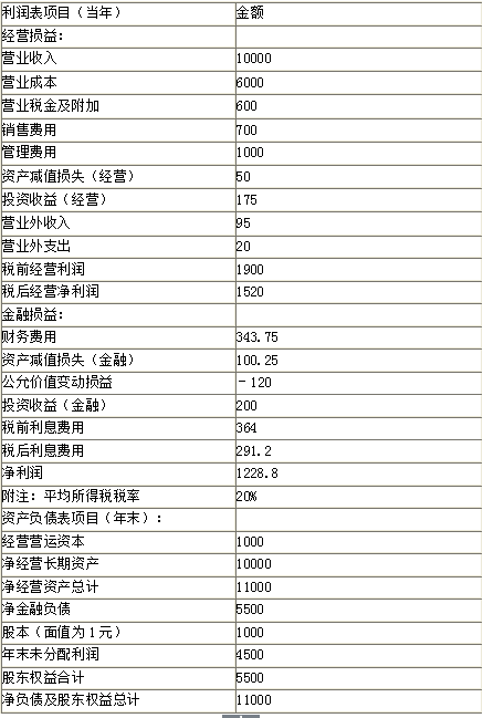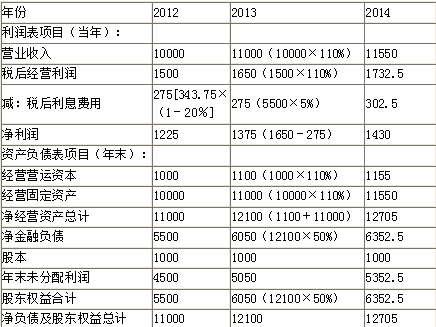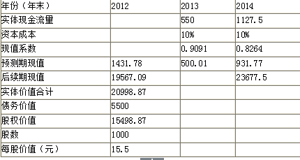 解析 表1 预计利润表和资产负债表 单位:万元 提示:2012年税后经营利润的计算过程: (10000-6000-600-700-1000+175)*(1-20%)=1500或:(1900-95+20+50)*(1-20%)=1500(万元) 2013年股东权益增加=6050-5500=550(万元),小于当年实现的净利润1375万元,因此企业不需要通过发行增发新股从外部筹资,股本不变。(4分) 【考点“现金流量折现模型参数的估计”】 基本公式:实体现金流量=税后经营利润-本期净投资 2013年:实体现金流量=1650-(12100-11000)=1650-1100=550(万元)(1分) 2014年:实体现金流量=1732.5-(12705-12100)=1732.5-605=1127.5(万元)(1分) 【考点“现金流量折现模型参数的估计”】 股权资本成本=3%+1.5*6%=12%(0.5分) 加权平均资本成本=8%*50%+12%*50%=10%(1.5分) 【考点“现金流量折现模型参数的估计”】 表2 实体现金流量法企业价值评估表 单位:万元 注:后续期现值=1127.5*(1+5%)/(10%-5%)*0.8264=19567.09(万元)(5分) 【考点“现金流量折现模型参数的估计”】 应该选择方案一,即以15000万元的价格买下F公司的全部股份,并承担F公司的原有债务。因为购买股份的价格15000万元小于股权价值15498.97万元。而购买资产价格22000万元大于F公司实体价值20998.87万元,所以购买资产不承担债务的方案在经济上不可行。(2分) 【考点“现金流量折现模型参数的估计”】