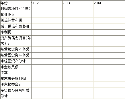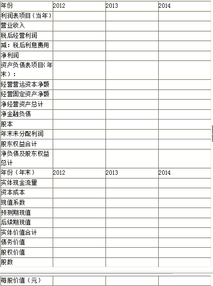 问题 汽车行业的G公司打算收购物流行业的F公司,请你对F公司的实体价值和股权价值进行评估。有关资料如下: (1)以2012年为预测基期,该年管理用利润表和资产负债表(部分)如下(单位:万元): 附注:经营性投资收益具有可持续性,随营业收入同比例变动;资产减值损失、公允价值变动损益、投资收益(金融)、营业外收入和营业外支出均不具有可持续性,预测时可以忽略不计。平均所得税税率为20%。 (2)以2013年和2014年为详细预测期,2013年的预计销售增长率为10%,2014年的预计销售增长率为5%,以后各年的预计销售增长率稳定在5%的水平。 (3)假设F公司未来的“税后经营净利润/营业收入”、“经营营运资本/营业收入”、“经营固定资产/营业收入”可以维持预测基期的水平(修正后)。 (4)假设F公司未来将维持基期的资本结构(净金融负债/净经营资产),并持续采用剩余股利政策。 (5)假设F公司未来的“净金融负债平均利息率(税后) ”为5%,各年的“利息费用”按年初“净金融负债”的数额预计。 (6)假设F公司税后债务成本为8%,β权益为1.5,当前市场的无风险报酬率为3%,权益市场的平均风险溢价为6%。 <1>、编制价值评估所需的预计利润表和资产负债表(计算结果填入下列给定的“预计利润表和资产负债表”中,不必列出计算过程)。 表1 预计利润表和资产负债表 单位:万元 <2>、计算F公司2013年和2014年的实体现金流量。 <3>、计算F公司的加权平均资本成本。 <4>、编制实体现金流量法的企业价值评估表(结果填入下列给定的“实体现金流量法企业价值评估表”,不必列出计算过程)。 <5>、目前有两个并购方案可供选择:①G公司以15000万元的价格买下F公司的全部股份,承担F公司的原有债务;②G公司以22000万元的价格买下F公司的全部资产,不承担F公司原有债务。假设该并购方案不产生并购溢价,请你为G公司做出经济上可行的并购决策并说明理由。