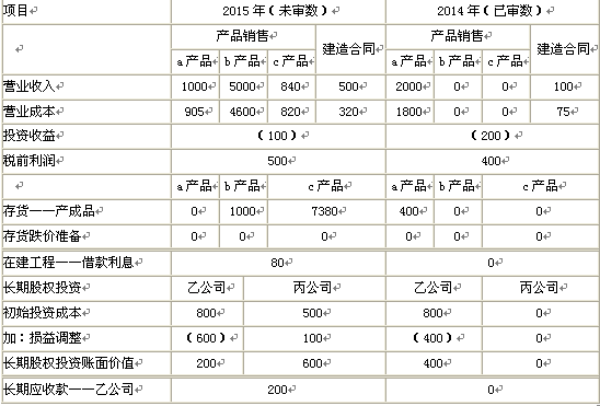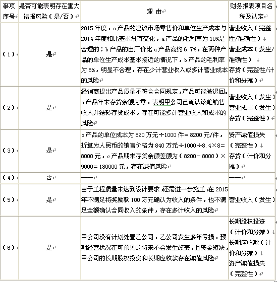 问题 甲公司是ABC会计师事务所的常年审计客户,拥有乙公司和丙公司两家联营公司。甲公司主要从事建材的生产、销售以及建筑安装工程。A注册会计师负责审计甲公司2015年度财务报表,拟于2016年4月1日出具审计报告。财务报表整体的重要性为25万元。   资料一:   A注册会计师在审计工作底稿中记录了所了解的甲公司情况及其环境,部分内容摘录如下:   (1)甲公司采用经销商买断方式销售a产品和b产品。2015年度,a产品的建议市场零售价、出厂价和单位生产成本较2014年基本没有变化。b产品是甲公司2015年2月推出的新产品,其建议市场零售价比a产品高20%。a产品和b产品的单位生产成本接近,其出厂价分别低于各自建议市场零售价的10%和20%。   (2)a产品于2015年11月停产。2015年末,某经销商采用交款提货方式购买最后一批a产品。甲公司已收到货款200万元,并已开具发票和发运凭单。经销商在验收日才发现该批产品质量不符合合同要求,双方尚未就解决方案达成一致意见。   (3)甲公司的记账本位币为人民币。2015年9月,甲公司与某外国客户签订合同,按固定销售价格定制10000件c产品,以欧元计价和结算。   甲公司一次性投料生产该批产品,并于2015年10月1日销售1000件,其余9000件按合同约定于2016年1月销售。甲公司未生产其他批次c产品。(假定2015年10月1日即期汇率为1欧元=8.4元人民币,2015年12月31日即期汇率为1欧元=8元人民币)   (4)甲公司于2015年3月1日借入2000万元、年利率为8%的专门借款,用于已开工建设并预计于2016年末完工的新生产线。甲公司无其他带息债务。因甲公司与施工方对工程质量存在纠纷,该工程于2015年5月1日至2015年8月31日中断。   (5)甲公司于2014年起从事建筑安装工程,截至2015年末仅承揽一项业务。建造合同约定,工程建设期为18个月,工程总价为500万元;如果工程提前3个月完工,并且质量符合设计要求,客户另付100万元奖励款。工程于2014年10月1日开工,于2015年12月末基本完工。经监理人员认定,工程质量未达到设计要求,还需进一步施工。   (6)甲公司持有乙公司40%股权,目前无处置计划。乙公司多年亏损,2015年度亏损500万元,预期其经营状况在未来5年内不会发生改变。2015年5月,乙公司因资金短缺,由甲公司为其代垫采购款200万元,并约定2年后还款。   资料二: