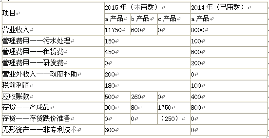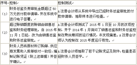 问题 甲公司是ABC会计师事务所的常年审计客户。A注册会计师负责审计甲公司2015年度财务报表,确定财务报表整体的重要性为240万元。   资料一:   A注册会计师在审计工作底稿中记录了所了解的甲公司情况及其环境,部分内容摘录如下:   (1)甲公司原租用的办公楼月租金为50万元。自2015年10月1日起,甲公司租用新办公楼,租期一年,月租金80万元,免租期3个月。   (2)2014年度,甲公司直销了100件a产品。2015年,甲公司引入经销商买断销售模式,对经销商的售价是直销价的90%,直销价较2014年基本没有变化。2015年度,甲公司共销售150件a产品,其中20%销售给经销商。   (3)2015年10月,甲公司推出新产品b产品,单价60万元。合同约定,客户在购买产品一个月后付款;如果在购买产品三个月内发现质量问题,客户有权退货。截至2015年12月31日,甲公司售出10件b产品。因上市时间较短,管理层无法合理估计退货率。   (4)2015年10月,甲公司与乙公司签订销售合同,按每件150万元的价格为其定制20件c产品,约定2014年3月交货,如不能按期交货,甲公司需支付总价款的20%作为违约金。签订合同后,原材料价格上涨导致c产品成本上升。截至2015年12月31日,甲公司已生产10件c产品,单位成本为175万元。   (5)2015年12月,甲公司首次获得200万元政府补助。相关文件规定,该补助用于补偿历年累计发生的污水处理支出。   (6)甲公司自2011年起研发一项新产品技术,于2015年12月末完成技术开发工作,并确认无形资产300万元。甲公司拟将其出售,因受国家产业政策的影响,市场对该类新产品尚无需求。   资料二:   A注册会计师在审计工作底稿中记录了有关制造费用的财务数据,部分内容摘录如下:   金额单位:万元  资料三:   A注册会计师在审计工作底稿中记录了审计计划,部分内容摘录如下:   (1)A注册会计师认为,如果发生与关联方及其交易相关的财务报表项目和披露错报,即使其金额低于财务报表整体重要性,仍可能影响财务报表使用者依据财务报表作出的经济决策,因此,确定与关联方及其交易相关的财务报表项目和披露的重要性水平为150万元。   (2)2015年,甲公司以8000万元的价格向关联方购买一条生产线。A注册会计师认为该交易超出甲公司正常经营过程,很可能不存在相关的内部控制,拟直接实施实质性程序。   (3)甲公司2015年度销售费用为900万元。A注册会计师认为重大错报风险较低,拟仅实施控制测试。   资料四:   A注册会计师在审计工作底稿中记录了实施的控制测试,部分内容摘录如下:  资料五:   A注册会计师在审计工作底稿中记录了实施的实质性程序,部分内容摘录如下:   (1)甲公司年末应付账款余额为1000万元。A注册会计师选取前10大供货商实施函证,均收到回函。回函显示一笔5万元的差异,管理层同意调整。因回函总额占应付账款余额的70%,错报明显微小且已更正,A注册会计师没有对剩余总体实施其他审计程序。   (2)2015年底,甲公司存在重大未决诉讼,内部法律顾问和外聘律师均认为败诉可能性较低,因此,管理层没有确认预计负债。A注册会计师认为该事项存在重大错报风险,检查了相关文件,并获取了管理层和内部法律顾问的书面声明,据此认可管理层的判断。   (3)甲公司财务人员手工编制了应收账款账龄分析表。A注册会计师了解了相关控制,认为控制设计有效,并就账龄分析表中账龄结构变化较大的项目询问了相关人员。A注册会计师基于该账龄分析表测试了坏账准备中按账龄法计提的部分。   资料六: