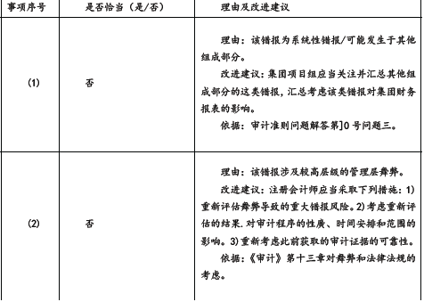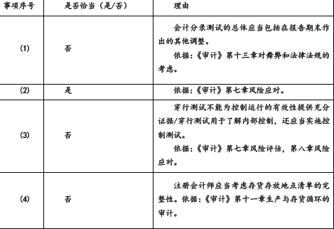 问题 甲集团公司是ABC 会计师事务所的常年审计客户,主要从事化妆品的生产、批发和零售。A 注册会计师负责审计甲集团公司2014 年度财务报表,确定集团财务报表整体的重要性为600 万元。 资料一: A 注册会计师在审计工作底稿中记录了审计计划,部分内容摘录如下: (1)子公司乙公司从事新产品研发。2014 年度新增无形资产1 000 万元,为自行研发的产品专利。A 注 册会计师拟仅针对乙公司的研发支出实施审计程序。 (2)子公司丙公司负责生产,产品全部在集团内销售。A 注册会计师认为丙公司的成本核算存在可能导致集团财务报表发生重大错报的特别风险,拟仅针对与成本核算相关的财务报表项目实施审计。 (3)甲集团公司的零售收入来自40 家子公司,每家子公司的主要财务报表项目金额占集团的比例均低于1%。A 注册会计师认为这些子公司均不重要,拟实施集团层面分析程序。 (4)DEF 会计师事务所作为组成部分注册会计师负责审计联营企业丁公司的财务信息,其审计项目组按丁公司利润总额的3%确定组成部分重要性为300 万元,实际执行的重要性为150 万元。 (5)子公司戊公司负责甲集团公司主要原材料的进口业务,通过外汇掉期交易管理外汇风险。A 注册会计师拟使用50 万元的组成部分重要性对戊公司财务信息实施审阅。 资料二: A 注册会计师在审计工作底稿中记录了甲集团公司的财务数据,部分内容摘录如下: 金额单位:万元 资料三: A 注册会计师在审计工作底稿中记录了风险应对的情况,部分内容摘录如下: (1)A 注册会计师在实施会计分录测试时,将甲集团公司全年的标准会计分录和非标准会计分录作为待测试总体,在测试其完整性后,对选取的样本实施了细节测试,未发现异常。 (2)A 注册会计师认为甲集团公司存在低估负债的特别风险,在了解相关控制后,未信赖这些控制,直接实施了细节测试。 (3)甲集团公司使用存货库龄等信息测算产成品的可变现净值。A 注册会计师拟信赖:与库龄记录相关的内部控制,通过穿行测试确定了相关内部控制运行有效。 (4)甲集团公司的存货存放在多个地点。A 注册会计师基于管理层提供的存货存放地点清单,并根据不同地点所存放存货的重要性及评估的重大错报风险确定了监盘地点。 资料四: A 注册会计师在审计工作底稿中记录了重大事项的处理情况,部分内容摘录如下: (1)因审计中利用的外部专家并非注册会计师,A 注册会计师未要求其遵守注册会计师职业道德守则的相关规定。 (2)化妆品行业将于2016 年执行更严格的化学成分限量标准,甲集团公司的主要产品可能因此被淘汰。 管理层提供了其对该事项的评估及相关书面声明,A 注册会计师据此认为该事项不影响甲集团公司的持续经营能力。 (3)在审计过程中,A 注册会计师与甲集团公司管理层讨论了值得管理层关注的内部控制缺陷,并在审计报告日后、审计工作底稿归档日前以书面形式向集团管理层和治理层通报了值得关注的内部控制缺陷。 (4)A 注册会计师认为甲集团公司2014 年某新增主要客户很可能是甲集团公司的关联方,在询问管理层和实施追加的进一步审计程序后仍无法确定,拟因此发表保留意见。 资料五: A 注册会计师在审计工作底稿中记录了处理错报的相关情况,部分内容摘录如下: (1)2014 年,甲集团公司推出销售返利制度,并在ERP 系统中开发了返利管理模块。A 注册会计师在对某组成部分执行审计时发现,因系统参数设置有误,导致选取的测试项目少计返利2 万元。A 注册会计师认为该错报低于集团财务报表明显微小错报的临界值,可忽略不计。 (2)A 注册会计师发现甲集团公司销售副总经理挪用客户回款50 万元,就该事项与总经理和治理层进行了沟通。因管理层已同意调整该错报并对相关内部控制缺陷进行整改,A 注册会计师未再执行其他审计工作。 (3)A 注册会计师使用审计抽样对管理费用进行了测试,发现测试样本存在20 万元错报。A 注册会计师认为该错报不重大,同意管理层不予调整。 (4)2014 年10 月,甲集团公司账面余额1 200 万元的一条新建生产线达到预定可使用状态。截至2014年年末,因未办理竣工决算,该生产线尚未转人固定资产。A 注册会计师认为该错报为分类错误,涉及折旧金额很小,不构成重大错报,同意管理层不予调整。 要求: (1)针对资料一第(1)至第(5)项,结合资料二,假定不考虑其他条件,逐指出资料一所列审计计划是否恰当。如不恰当,简要说明理由。 (2)针对资料三第(1)至第(4)项,假定不考虑其他条件,逐项指出A 注册会计师的做法是否恰当。如不恰当,简要说明理由。 (3)针对资料四第(1)至第(4)项,假定不考虑其他条件,逐项指出A 注册会计师的做法是否恰当。如不恰当,简要说明理由。 (4)针对资料五第(1)至第(4)项,假定不考虑其他条件,逐项指出