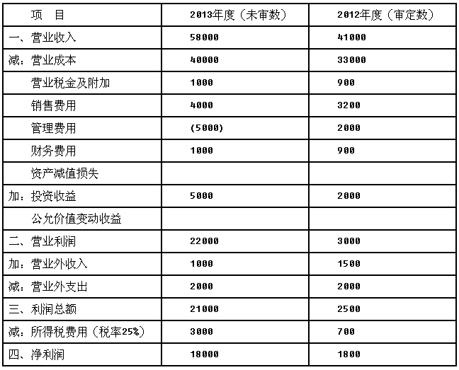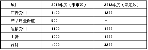 解析 (1)利润表中的异常波动项目:营业收入、营业外收入、营业外支出、营业成本、管理费用、投资收益、所得税费用。 报表显示,营业收入比上年增加了17000(58000-41000)万元,增幅为1700041000=41.46%;营业成本增加了7000(40000-33000)万元,增幅为700033000=21.21%;2013年毛利率=1800058000=31.03%;2012年毛利率=800041000=19.51%;所以营业收入和营业成本异常。收入在增加,而管理费用在2013年冲销过多,是最异常的项目;投资收益比上年增加了3000万元,增幅为150%;所得税费用比上年增加了2300万元,增幅为328.57%,且计算的所得税税率为300021000=14.29%,与给出的所得税税率25%相差较大。营业外收支项目,由于是企业不常发生的业务,不管金额的变化大小,一般情况下每年都会作为审计的重点项目来进行测试,而注册会计师了解到,Y公司2013年度的经营形势、管理及组织架构与上年度比较未发生重大变化(与收入费用等有关),且未发生重大重组行为(与投资收益有关),这些项目波动的幅度较大,应认为异常。 (2)需重点审计的销售费用项目:产品质量保证费用。 由于产品质量保证费用一般按销售额的百分比提取,2012年的营业收入为41000万元,没有质量保证费用,而2013年的营业收入为58000万元,却增加了质量保证费用500万元,应重点审计,检查是否存在人为调节费用的情况。