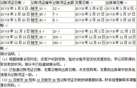 解析 ①第(1)事项,注册会计师的审计程序存在不当之处,因为已经说明“在客户收到货物、验收合格并签发收货通知后,甲公司才取得收取货款的权利”,所以此时注册会计师在审计中仅仅检查了销售合同是不够的,还应该检查客户签发的收货通知单。   ②第(2)事项,注册会计师的审计程序存在不当之处,对1月转字10号记账凭证未实施进一步检查,该记账凭证的日期早于发票日期和出库单日期,要实施进一步检查;同时还应核对客户签发的收货通知单日期。   ③第(3)事项,注册会计师的审计程序存在不当之处。对11月转字28号和12月转字50号记账凭证未实施进一步检查,上述两笔记账凭证反映的销售额明显高于其他测试项目,有可能表明存在舞弊,不应仅依赖管理层的解释。