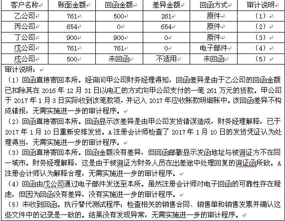 ABC会计师事务所承接甲公司2016年财务报表审计。A注册会计师选取5个应收账款明细账户,对截至2016年12月31日的余额实施积极式函证,并根据回函结果...