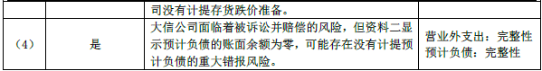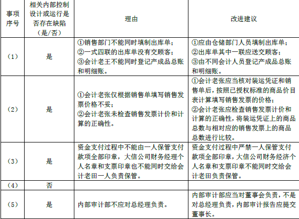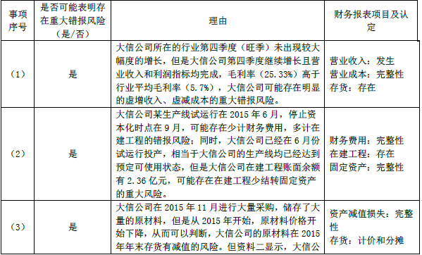 问题 ABC会计师事务所首次承接审计上市大信公司2015年度财务报表,XYZ会计师事务所是连续多年审计大信公司的前任注册会计师事务所。大信公司主要从事煤炭的生产和销售。A注册会计师作为审计项目合伙人,了解大信公司及其环境后,确定了财务报表整体重要性120万元。 资料一: A注册会计师在审计工作底稿中记录了所了解的大信公司情况及其环境,部分内容摘录如下: (1)大信公司所在的煤炭行业受国家限电政策的影响,煤炭产量增加在传统的第四季度(旺季)未出现较大幅度的增长,大信公司2015年度第四季度与前3个季度相比,保持了继续增长,2015年审计前财务报表显示其完成了1 5000万元营业收入和3 800万元毛利的经营目标。2015年全国煤炭行业平均毛利率为5.7%。 (2)大信公司某生产线在2015年6月试运行投产,9月停止资本化。 (3)随着煤炭价格的不断上涨,大信公司主要原材料采购价格也一直在上升。大信公司预计主要原材料价格在2015年底前很可能还要上升,因此在2015年11月进行大量采购,以满足2015年1月底前的生产需求。但2015年开始,相关原材料市场价格实际上开始下跌。 (4)2015年12月,由于煤炭生产带来的污染,给附近居民的鱼塘带来了不利的影响,同时,厂区粉尘污染严重,周边居民对此一直在政府门前静坐要求政府出面解决。附近居民已经对大信公司提起诉讼,要求大信公司进行巨额赔偿。大信公司律师认为根据相关法规,大信公司很可能赔偿的金额是150万元,大信公司董事会决议淘汰一批旧设备,从德国进口一批低污染排放的生产设备来解决污染问题。 资料二: A注册会计师在审计工作底稿中记录了所获取的大信公司财务数据,部分内容摘录如下: 资料三: A注册会计师在审计工作底稿中记录了审计计划,部分内容摘录如下: (1)A注册会计师认为,如果发生与关联方及其交易相关的财务报表项目和披露错报,即使其金额低于财务报表整体重要性,仍可能影响财务报表使用者依据财务报表做出的经济决策,因此,确定与关联方及其交易相关的财务报表项目和披露的重要性水平为100万元。 (2)2015年,大信公司以8 000万元的价格向关联方购买一条生产线。A注册会计师认为该交易超出大信公司正常经营过程,很可能不存在相关的内部控制,拟直接实施实质性程序。 (3)大信公司2015年度销售费用为900万元。A注册会计师认为重大错报风险较低,拟仅实施控制测试。 资料四: A注册会计师在相关审计工作底稿中记录了了解和测试的内部控制事项,部分事项摘录如下: (1)发出煤炭产成品时,由销售部门填制一式四联的出库单。出库单第一联交仓库登记产成品卡片,第二联交发运部门,第三、四联交财务部老王,由老王负责登记产成品总账、明细账。 (2)会计老张负责开具销售发票。在开具销售发票之前,先核对装运凭证和销售单,然后根据销售单填写销售发票价格。 (3)财务部门审核付款凭单后,支付采购款项。出纳老李根据已批准的付款凭单,在确定支票收款人名称与付款凭单内容一致后签署支票,并在付款凭单上加盖“已支付“的印章。为了方便付款,公司签署支票所需的支票印章、财务经理个人名章由会计老田负责保管。 (4)生产计划部门根据已批准顾客订单,签发预先顺序编号的生产通知单。生产车间接到生产通知单,各生产小组编制原材料领用申请单,并经车间主任签字批准。仓库部门根据经审批的原材料领用申请单,填制预先编号的原材料发料单,发料单一式四联,其中一联留存,一联连同材料交给领料部门,一联留在仓储中心登记材料明细账,一联交财务部门进行材料收发核算和成本核算。 (5)大信公司设立了内部审计部,并直接对总经理负责。每年对子公司和各业务部进行审计,将出具的内部审计报告提交总经理。 资料五: