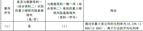 选项 A注册会计师在审计工作底稿中记录了拟实施的控制测试和实质性程序,部分内容摘录如下: (1)计算本年重要产品的毛利率,与同行业进行比较,检查是否存在异常,是否存在较大波动,查明原因。 (2)获取产品价格目录,抽查售价是否符合价格政策,并注意销售给关联方或关系密切的重要客户的产品价格是否合理,有无以低价或高价结算的方法相互之间转移利润的现象。 (3)抽取本年营业收入一定数量的记账凭证,检查相应的销售发票、销售合同是否与存货出库日期、品名、数量等一致。 (4)独立测算主要存货项目的年末可变现净值,将测算结果与大信公司的计算结果进行比较,分析差异原因。 (5)依据借款和工程建设情况计算借款费用资本化金额,并与被审计单位实际的借款费用资本化情况进行比较。 (6)查阅资本支出预算、公司相关会议决议等 ,检查本年增加的在建工程是否全部得到记录。 要求: (1)针对资料一第(1)至(4)项,结合资料二,假定不考虑其他条件,逐项指出资料一所列事项是否可能表明存在重大错报风险。如果认为存在重大错报风险,简要说明理由,并说明该风险主要与哪些财务报表项目(仅限于营业收入、营业成本、存货、在建工程、固定资产、财务费用、资产减值损失、预计负债、营业外支出)的哪些认定相关。 (2)针对资料三第(1)至(3)项,假定不考虑其他条件,逐项指出资料三所列审计计划是否恰当。如不恰当,简要说明理由。 (3)针对资料四第(1)至(5)项,假定未描述的其他内部控制不存在缺陷,请指出甲公司以上事项的内部控制设计或运行中是否存在缺陷,如果存在缺陷,请分别说明理由并提出改进建议。 (4)针对资料五第(1)至(6)项,假定不考虑其他条件,逐项指出审计程序与根据资料一(结合资料二)识别的重大错报风险是否直接相关。如直接相关,指出对应的是识别的哪一项重大错报风险,并简要说明理由。