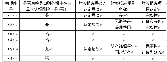 选项 A注册会计师在审计工作底稿中记录了所了解的甲公司财务报表的相关状况,部分内容摘录如下: (1)购入的一批材料还在途中,没有列入期末存货项目中。 (2)3月购入的办公用设备和一项专利技术,均从4月份开始计提折旧和摊销。 (3)购入的用于生产M产品的C材料,市场价格已经严重下跌,但生产的M产品的市价并没有降低,因此甲公司并没有针对C材料计提存货跌价准备。 (4)董事会已经作出书面决议,将甲公司的一处仓库用于经营出租并且短期内不再发生变化,甲公司将其确定为投资性房地产。 (5)生产用的某项设备和某种材料,因市价回升,甲公司将其原已计提的减值准备转回。 (6)12月购入的一批原材料,因供货方提供了10%的商业折扣,甲公司按照扣除了商业折扣后的金额记录了应付账款。 要求:针对上述每一种情况,分别指出是否会直接导致财务报表存在重大错报风险。将答案填入下表的空格中。