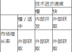 解析 该题考查的是研发技术获取途径选择的依据。 是内部开发还是外部开发,从上述二维模型可以看出,要跟着技术、市场的步伐走。