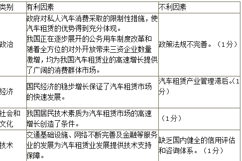 解析 1.汽车租赁产业所处的生命周期阶段:成长期。(1分) 理由:顾客群已经扩大,顾客对租赁服务的质量要求不是很高。 主要战略路径:市场营销,此时是改变价格形象和质量形象的好时机。(1分) 【该题针对“产品生命周期”知识点进行考核】 2.PEST分析 【该题针对“产品生命周期”知识点进行考核】 3.五力模型分析: 供应者的议价能力较强。国内汽车租赁业规模较小,难以通过规模优势与汽车制造厂商建立紧密的合作关系。(1分) 购买者的议价能力较强。国内汽车价格的逐年下降和价格折让的混乱加大了汽车租赁企业的经营风险,购买者处于相对优势地位,议价能力较强。(1分) 【该题针对“产品生命周期”知识点进行考核】