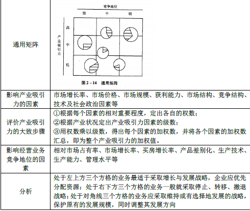 解析 处于左上方三个方格的业务最适于采取增长与发展战略,企业应优先分配资源;处于右下方三个方格的业务一般就采取停止、转移、撤退战略;处于对角线三个方格的业务应采取维持或有选择地发展的战略,保护原有的发展规模,同时调整其发展方向。 【补充知识点】通用矩阵