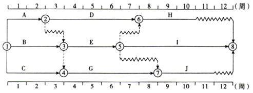 解析 双代号时标网络计划中工作总时差的判定应从网络计划的终点节点开始,逆着箭线的方向依次进行。①以终点节点为完成节点的工作,其总时差应等于计划工期与本工作最早完成时间之差;则工作H的总时差TF6-8=12-10=2(周),工作I的总时差TF5-8=12-12=0(周),工作J的总时差TF7-8=12-11=1(周);②其他工作的总时差等于其紧后工作的总时差加本工作与紧后工作之间的时间间隔所得之和的最小值,即:TFi-j=min{TFj-k+LAGi-j,j-k},工作D总时差TF2-6=min{TF6-8+LAG2-6,6-8)=2(周),工作E总时差TF3-5=min{TF6-8+LAG3-5,6-8,TF5-8+LAG3-5,5-8,TF7-8+LAG3-5,7-8}=min{3,0,3}=0(周),工作G的总时差TF4-7=min{TF7-8+LAG4-7,7-8}=1(周),工作A的总时差TF1-2=min{TF2-6+LAG1-2,2-6,TF3-5+LAG1-2,3-5}=min{2,1}=1(周)。