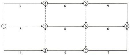 解析 总持续时间最长的线路称为关键线路。如图所示,线路①→③→④→⑤→⑧,①→③→⑥→⑦→⑧和①→②→⑦→⑧的持续时间最长,为20d,故有3条关键线路。
