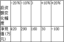 解析 临界点是指项目允许不确定因素向不利方向变化的极限值。超过极限,项目的效益指标将不可行。根据已知条件可以列出净现值y与投资额变化幅度X的方程式: y=-13X+160 当Y=0时,X就是该建设项目投资额变化幅度的临界点,即X=+12.31%。