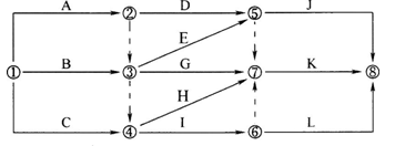 某工程双代号网络计划如下图所示,工作B的后续工作有(  )。 A.工作D B.工作E C.工作J D.工作K E.工作L
