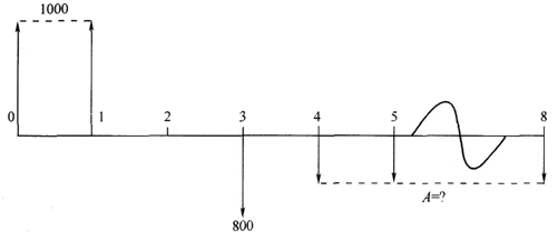 解析 考点:等值计算。首先根据题意画现金流量图见下图,正确的现金流量图是正确计算的前提,所以必须把现金流量发生的时点找准确。 其次将已知的现金流量折算到一点,而且是与所求年金有关的点,本题可以折算到第3年末,或第8年末。若折算到第3年末,则是已知现值求年金,用资本回收公式计算即可。A=[1000(A/F,6%,2)(F/P,6%,2)-800](A/P,6%,5)=359.6(万元)。本题要注意建设期两笔