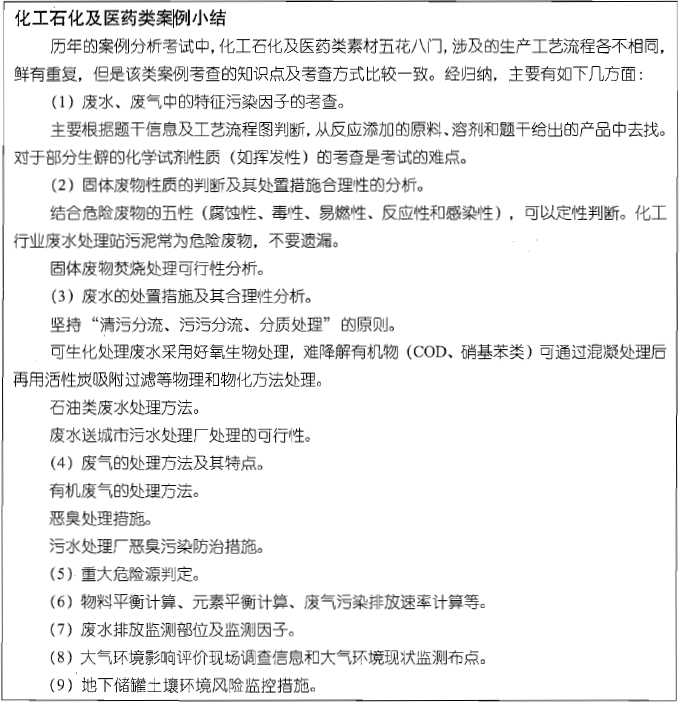 解析 1.给出VC M生产过程中总汞的平衡图。 附1:VCM生产过程中总汞的平衡图。 2.说明本项目废水排放监控应考虑的主要污染物及监控部位。 答:本项目废水排放监控主要应考虑的污染物为: (1)Hg,监控部位为预处理设施排放口; (2)COD、SS、pH、石油类、氯离子,监控部位为全场排放口。 3.识别液氯储存单元的风险类型,给出风险源项分析内容。 答:液氯储存单元风险类型为:液氯储罐的破裂、泄漏。 风险源项分析内容为确定液氯储罐破裂或泄漏时最大可信事故的发生概率、液、氯储罐最大可信事故的泄漏量。 4.在VCM生产单元氯元素投入、产出平衡计算中,投入项应包括的物料有哪些? 答:投入项应包括的物料有HCI和HgC120 5.本项目的环境空气现状调查应包括哪些特征污染因子? 答:空气特征污染因子为:HCl、Cl2、Hg、VCM。 【考点分析】 1.给出VC M生产过程中总汞的平衡图。 《环境影响评价案例分析》考试大纲中“二、项目分析(1)分析建设项目生产工艺过程的产污环节、主要污染物、资源和能源消耗等,给出污染源强,生态影响为主的项目还应根据工程特点分析施工期和运营期生态影响的因素和途径,和《技术方法》考试大纲中“一、工程分析(一)污染型项目工程分析(3)掌握物料平衡法、类比法及资料复用法的基本膘理及计算方法。 物料平衡一直是技术方法和案例分析的重点之一,本书“二、化工石化医药类案例4某化工制造工程”对该方法进行了详细解释。 2.说明本项目废水排放监控应考虑的主要污染物及监控部位。 《环境影响评价案例分析》考试大纲中“六、环境保护措施分析(5)制定环境管理与监测计划”。 3.识别液氯储存单元的风险类型,给出风险源项分析内容。 《环境影响评价案例分析》考试大纲中“五、环境风险评价(1)识别重大危险源并描述可能发生的风险事故” 重大危险源相关考题为环评案例分析考试的高频考点。其他的问题形式有: (1 )识别该项日的重大危险源, 说明理由。 (2) 该项目是否存在重大危险源, 说明理由。 举一反三: 重大危险源类考题涉及的知识点包括: (1)风险评价的基本内容。包括风险识别、源项分析、后果计算、风险计算和评价以及风险管理五部分。 ( 2 ) 危险源危险类型。包括火灾、泄漏、爆炸三种。 (3 )风险源项分析内容。包括确定最大可信事故发生概率和估算危险化学品的泄漏量。 ( 4 ) 最大可信事故:指所有预测概率不为零的事故中, 对环境危害最严重的事故。 ( 5 ) 重大危险源的辨识: ①长期或临时地生产、加工、使用或储存危险化学品,且危险化学品的数量等于或超过临界量的单元。 ②单元内存在的危险化学品为多品种时, 则按下式计算, 若满足, 则定为重大危险源: 注: 单元是指一个(套〉生产装置、设施或场所,或同属一个生产经营单位且 边缘距离小于500m 的几个〔套〉生产装置、设施或场所。 4 . 在VCM 生产单元氢元素投入、产出平衡计算中, 投入项应包括的物料有哪些? 《环境影响评价案例分析》考试大纲中 二、项目分析( 1 )分析建设项目施工期和运营期环境影响的因素和途径,识别产污环节、污染因子和污染物特性,核算物耗、水耗、能耗和主要污染物源强。 5.本项目的环境空气现状调查应包括哪些特征污染因子? 《环境影响评价案例分析》考试大纲中“三、环境现状调查与评价(2)制定环境现状调查与监测方案”。 本题考点是考查考生对一个行业环境影响识别的能力。考试在遇到此类问题时,要结合行业特点,参考工艺流程图及主要原辅材料分析其特征污染物,只有进入大气中的特征污染物才可能成为环境空气现状调查中的大气特征污染因子。