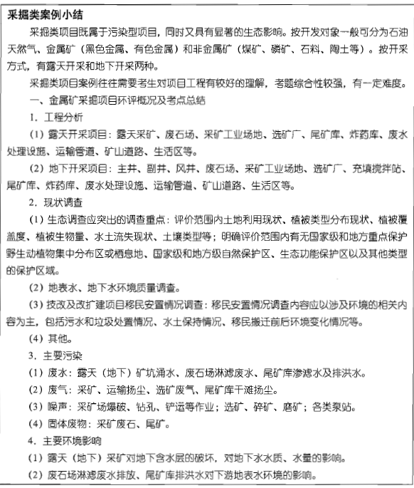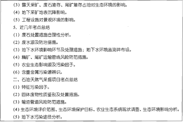 解析 1.试确定本项目的生态评价范围。 答:由于本项目500m外涉及敏感保护目标,即省级天然林自然保护区,故生态环境评价等级确定为一级。 根据该类项目特点,从开采境界这一区域来评价,生态评价范围是以油田开发区域35km2为基础向周边扩展3km范围。 输油管线评价范围是工程占地区外围500m,虽然在500m外的省级天然林自然保护区内没有任何生产及施工行为,但生态影响评价范围应将该省级天然林自然保护区包括在内。 2.本项目的生态环境保护目标有哪些? 答:本项目的生态环境保护目标主要有:省级天然林保护区、B县集中式饮用水源地二级保护区、基本农田、草地、林地、水塘和地表水(白河、荆河)。 3.请识别本项目环境风险事故源项,判断事故的主要环境影响。 答:本项目环境风险事故源项主要是:钻井作业发生井喷事故、集输管线破裂及站场等储油设施破损导致原油泄漏或遇火引发的环境风险事故、井壁坍塌导致地下水污染事故。 环境风险事故的主要环境影响表现在: (1)在事故条件下,原油中烃类组分挥发进入大气造成大气环境污染,将危及人群健康和生命。如果由此引发火灾事故,会对大气环境、周边人群及生态环境造成危害。 (2)事故时,泄漏的原油会造成土壤的污染,使土壤透气性下降,影响植物生长,严重时可导致植物死亡。 (3)泄漏的原油会随地表径流进入地表水,造成水体污染,不仅影响水生生物正常生长与繁殖,还会影响地表水功能。 (4)石油烃类着火发生爆炸易酿成安全事故,在灭火过程中不仅大量的人员、机械活动会对生态造成破坏,还存在灭火剂对环境的污染。 (5)井壁坍塌有可能导致原油和回注水(往往含盐量较高)串流至饮用水开采层,导致地下水污染。 4.从环境保护角度判断完井后固体废物处置方式存在的问题,并简述理由。 答:钻井废弃泥浆、钻井岩屑、钻井废水采取在井场泥浆池中自然干化,就地处理,这种方式存在环境污染问题,不符合固体废物处置规范。 理由:钻井废弃泥浆、钻井岩屑、钻井废水虽然均产生于井场钻井过程,但分别属于不同的污染物类型,其具体来源、成分均不同,不应混合在一起处理,且现状处理方式不符合固废处理的减量化、资源化、无害化原则,而应分别进行处理。正确做法是:将井场泥浆池进行防渗处理,并设置围堰(防止钻井泥浆及废水渗漏外溢)及渗滤液导排装置,渗滤液收集后集中处理。废弃泥浆加固化剂同化后就地填埋,表面覆土并种植植被恢复生态环境。 5.简述输油管道施工对生态的影响。 答:输油管道施工对生态将会产生下列影响: (1)本输油管道施工主要会对油田开发区内地表植被、土壤、河流(白河)等沿线区域造成明显的破坏或不利的影响。主要表现在: ①施工将改变原来的土地利用类型; ②输油管道施工将破坏地表保护层,加快土壤侵蚀过程,使沿线区域失去其原有的生态功能; ③输油管道施工将对区域内自然植被产生一定程度的破坏,因管道中心线两侧不能种植根深植物; ④由于施工期内输油管线将穿越白河,因此白河的水质及水生生物会受到短期影响。 (2)由于其距离省级天然林自然保护区较近,因此,虽然不占用保护区土地,但施工时对自然保护区将产生间接的不利影响,主要表现在: ①临时用地可能选择在距离保护区更近的区域; ②施工活动对林地内野生动物的干扰; ③保护区外围地带的生态环境变差。 【考点分析】 2006年、2008年及2009年全国环境影响评价工程师职业资格考试中都有油田开发项目,其属于采掘类行业案例。本题与2008年真题类似。 1.试确定本项目的生态评价范围。 《环境影响评价案例分析》考试大纲中四、环境影响识别、预测与评价(3)确定评价工作等级和评价范围。 举一反三: 根据《环境影响评价技术导则一陆地石油天然气开发建设项日》生态环境影响评价范围的确定原则如下:? 本项目属于油田开采项目,必须按照《环境影响评价技术导则一陆地石油天然气开发建设项目》(HJ/T349-2007)进行答题。 2.本项目的生态环境保护目标有哪些? 《环境影响评价案例分析》考试大纲中三、现状调查与评价(1)判定评价范围内环境敏感区。 3.请识别本项目环境风险事故源项,判断事故的主要环境影响。 《环境影响评价案例分析》考试大纲中五、环境风险评价(1)识别重大危险源并描述可能发生的环境风险事故。 举一反三: 环境风险评价是环境影响评价的重要内容。在做任何一个案例题目时,均应考虑其是否有环境风险因素。如果有,就需要深入地进行分析评价。不仅只有污染型项目需进行环境风险评价,交通运输项目也涉及环境风险评价,如公路、铁路、石油天然气输送管道等;此外,采掘类项目也涉及环境风险评价,如石油开采、天然气开采、煤层气开采、煤矿开采等。 对于油田开发项目而言,环境事故主要发生于钻井(井下作业)、原油集输管线以及站场等工艺环节,潜在危险因素主要有腐蚀、误操作、设备缺陷、设计问题,涉及的主要事故类型为井喷事故和管线破裂导致的泄漏。 4.从环境保护角度判断完井后固体废物处置方式存在的问题,并简述理由。 《环境影响评价案例分析》考试大纲中六、环境保护措施分析(1)分析污染控制措施的技术经济可行性。 举一反三: 当考生遇到涉及固体废物处置的问题时,首先应当辨别固体废物是一般固体废物还是危险固体废物