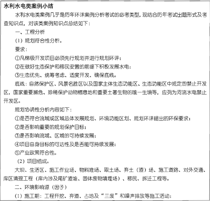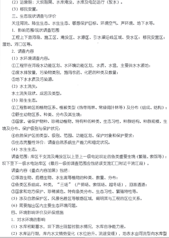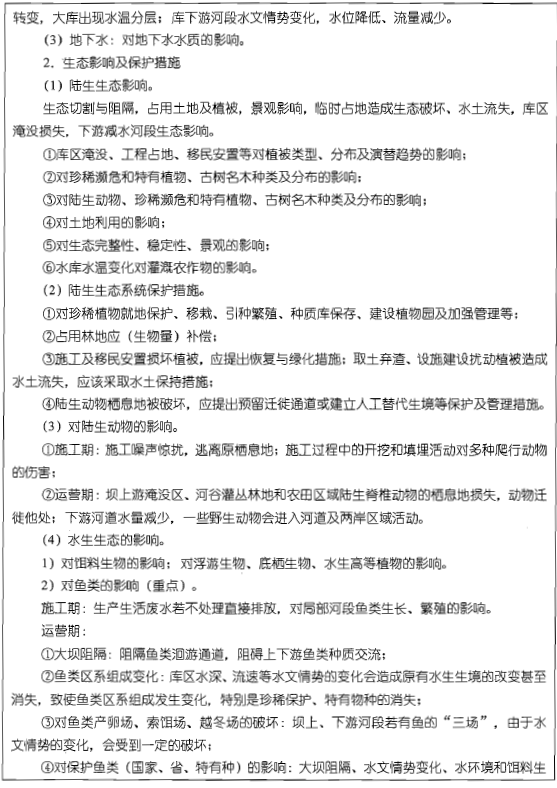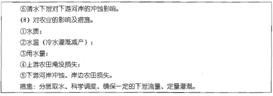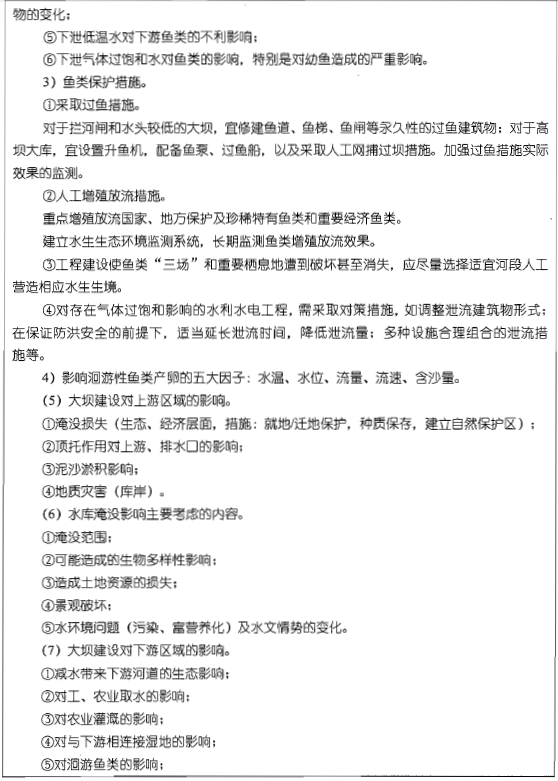 解析 1.生态环境现状应调查哪些内容?应采取哪些调查方法? 答:(1)重点调查内容。 ①森林调查:要阐明植被类型、组成、结构、特点,生物多样性等;评价生物损失量、物种影响、有无重点保护物种、有无重要功能要求。 ②陆生和水生动物:种群、分布、数量;评价生物损失、物种影响、有无重点保护物种。要阐明是否有鱼类三场(产卵场、索饵场、越冬场)、洄游通道分布。特别要明确区内是否有国家和地方保护、珍稀濒危特有鱼类的分布,如有需阐明其生态习性、繁殖特性等。 ③农业生态调查与评价:占地类型、面积,占用基本农田数量,农业土地生产力,农业土地质量; ④水体流失情况调查:侵蚀模数、程度、侵蚀量及损失,发展趋势及造成的生态问题,工程与水土流失的关系。 ⑤景观资源调查与评价:由于项目涉及自然保护区、风景名胜区等敏感区域,故要阐明敏感区域与工程的区位关系及自然保护区、风景名胜区内保护动植物数量、名录、生活习性、分布范围等。 (2)主要调查方法。主要有收集资料法(当地有关部门的各类规范性文件、技术资料、有关科研单位的研究成果、航拍资料)、现场踏勘法(实际观察与样方调查)、遥感及GPS技术应用、访问专家及当地群众等。 遥感技术应用需专业人员结合现场调查进行,主要是制作遥感图件,并解译出相关信息。 2.大坝建设对半洄游性鱼类、洄游性鱼类有何影响?应采取什么措施? 答:(1)影响。 ①大坝修建后,下游的半洄游性鱼类、洄游性鱼类无法洄游至上游,位于库区的产卵场将不复存在,河流梯级开发后其产卵场亦将全部消失,由此会影响半洄游性鱼类、洄游性鱼类的繁殖。 ②大坝修建后,一些适应于激流环境并且以摄食底栖生物为主的特有鱼类,因其适宜的生境已完全消失而在水库中绝迹。它们是无法通过水库上下交流的,因而大坝建设直接影响半洄游性鱼类、洄游性鱼类的生长。 (2)措施。 一种是采取工程措施,建鱼梯、鱼道,让洄游鱼类正常返回栖息和繁殖地;另一种是对洄游鱼类进行人工繁殖。同时,应设定水电站大坝的下泄基流量。 3.大坝建设对下游河道、农灌及工业用水有何影响? 答:(1)对下游工、农业取水的影响。如果取水口处于减水段,则会导致农灌、工业用水量的不足,可用水量减少甚至缺失,严重影响下游工、农业生产的发展。 (2)减水灌溉对农业生产产量的影响。冷水灌溉对生长期及产量有影响。 (3)对下游湿地的影响。减水的河道流量大大减少,下游湿地可能因此而消失。 (4)对洄游性鱼类造成严重的影响,导致洄游鱼类无法洄游到大坝上游,影响其索饵或繁殖。 (5)清水下泄改变河道原来的水文情势,对下游河岸产生冲蚀影响。 4.移民安置影响评价应评价哪些内容? 答:一般评价对移民生活、就业和经济状况的影响,移民安置区土地开发利用对环境的影响。包括: (1)对移民生产条件、生活质量的影响:应考虑搬迁初期、搬迁后期;预测移民环境容量和移民生产条件、生活质量及环境状况,并从生态保护角度分析移民环境容量的合理性。 (2)对水环境的影响:应预测生产和生活废污水量、主要污染物及对水质的影响。 (3)对生态环境的影响:移民后开发、工程建设和农田开垦,将进一步破坏生态系统。 (4)对社会环境的影响:移民从水电站库区迁移到异地,对当地的风俗、社会习惯产生影响。 (5)对人群健康的影响:移民搬迁把原来的流行传染疾病一并转移,对当地人群健康产生影响。 5.对评价区国家保护植物种采取什么保护措施? 答:(1)对施工人员进行野生植物保护的宣传教育。 (2)建立生态破坏惩罚制度,禁止野外用火。 (3)征求文物、林业等部门的意见,对名木采取工程防护、移栽、引种繁殖栽培、种质库保存及挂牌保存。 【考点分析】 1.生态环境现状应调查哪些内容?应采取哪些调查方法? 《环境影响评价案例分析》考试大纲中三、环境现状调查与评价(2)制定环境现状调查与监测方案。 2.大坝建设对半洄游性鱼类、洄游性鱼类有何影响? 应采取什么措施? 《环境影响评价案例分析》考试大纲中四、环境影响识别、预测与评价(4)确定环境要素评价专题的主要内容和六、环境保护措施分析(2)分析生态影响防护、恢复与补偿措施的技术经济可行性。 举一反三: 大坝建设对生态环境的影响是水利水电建设项目必须关注的重要问题,评价中必须对河流生态结构与功能有充分的调查和认识,大坝建设导致的淹没、阻隔、径流变化是对河流生态系统最大的干扰,评价中应根据《环境影响评价技术导则一生态影响》中提供的景观生态学评价方法,重点评价大坝建设对河流廊道的生态功能的影响,并要考虑河流的连续性的生态功能。 一般情况下,水利水电项目水生生态影响要分析水文情势变化造成的生境变化,对浮游植物、浮游动物、底栖生物、高等水生植物的影响,对国家和地方重点保护水生生物,以及珍稀濒危特有鱼类及渔业资源等的影响,对三场分布、洄游通道(包括虾、蟹)、重要经济鱼类及渔业资源等的影响。 3.大坝建设对下游河道、农灌及工业用水有何影响? 《环境影响评价案例分析》考试大纲中四、环境影响识别、预测与评价(4)确定环境要素评价专题的主要内容。 举一反三: 引水式电站环境对于河道生态影响比较大,主要是由于大坝建设会造成下游河道的减水。对于此类电站对河流生态