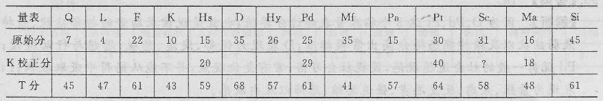 解析 K分的知识点,从测验结果可以得出Hs+0.5K=15+0.5K=20,K=10,Sc原始分为31,K=10,根据校正公式Sc+1.0K,得出Sc量表的K校正分应当为4。 第一,根据题目要求,需要关注的要点是:是单选还是多选,MMPI.测验结果的解释。 第二,考察对在中国常模中MMPI测验结果的解释以及效度量表的解释应用。 1.知识点:分数解释 在中国常模中,MMPI的T分在60分以上.便可能有病理性异常表现或某种心理偏离现象。 2.临床量表包括以下10个量表。 效度量表:Q若在前399题中原始分超过2,若在566版中原始分数超过30分.提示一床量表不可信。 L(Lie)说谎分数,得分超过10分,就不能信任MMPI的结果。 F(Validity)诈病量表,分数高表示不认真,理解错误,表现为一组互相无关的症状,或在伪装疾病;但如果测验有效,说明是精神病程度的良好指标,得分越高暗示精神程度越严重。 K(Correction)校正分量表,在以下5个量表的原始分数上分别加上一定比例的K分:Hs+0.5K;Pd+0.4K;Pt+1.0K;Sc+1.0K;Ma+0.2K。