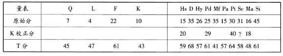 解析 【考察重点】MMPI量表中K校正分的计算【试题解析】其中5个量表的原始分需要加上一定比例的K分:Hs+0.5K、Pd+0.4K、Pt+1.0K、Sc+1.0K、Ma+0.2K。由量表中查得:Sc原始分为31,K原始分为100根据公式可得:Sc的K校正分为41。故选项为C。 【考察重点】MMPI结果的解释【试题解析】MMPI的美国常模标准为70分,中国常模标准为60分。本测验结果中,超出60分的包括:D(抑郁)、Pd(社会病态)、Pt(精神衰弱)、Si(社会内向)。故对应的选项有BD。