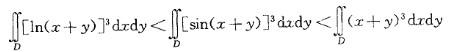 解析 提示:为了观察方便,做出平面区域D的图形,区域D在直线x+y=1的下方,在直线x+y=1/2上方以及由直线x= 0,y = 0围成。积分区域D上的点满足1/2≤x+y≤1。 故ln(x+y) ≤0,[ln(x+y)]3 ≤0 由三角函数知识,当0故033 所以平面区域D上的点满足: [ln(x+y)]33 3 由二重积分性质: