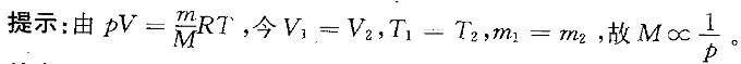 问题 有两种理想气体,第一种的压强记作p1,体积记作V1,温度记作T1,总质量记作m1,摩尔质量记作M1;第二种的压强记作p2,体积记作V2,温度记作T2,总质量记作m2,摩尔质量记作M2;当V1=V2,T1=T2,m1=m2时,则M1/M1为:
