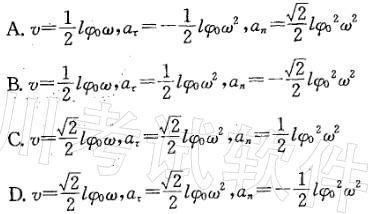 单摆由长l的摆杆与摆锤A组成,其运动规律φ=φ0sinωt。锤A在秒的速度、切向加速度与法向加速度分别为: