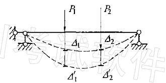 图示弹性梁上,先加P1,引起A、B两点挠度分别为Δ1、Δ2,再加P2,挠度分别增加Δ'1和Δ'2,则P1做的总功为:A. P1Δ1/2B....