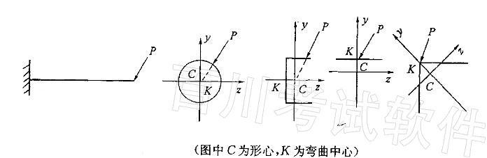 问题 如图所示悬臂梁受力P作用。在图示四种截面的情况下,其最大正应力(绝对值)不能用公式计算的是哪种截面? A.圆形 B.槽形 C.T形 D.等边角钢