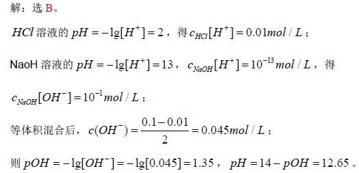 将pH=2.00 的HCl 溶液与pH=13.00 的NaoH 溶液等体积混合后,溶液的pH 值是:(A)7.00 (B)12.65(C)3.00...