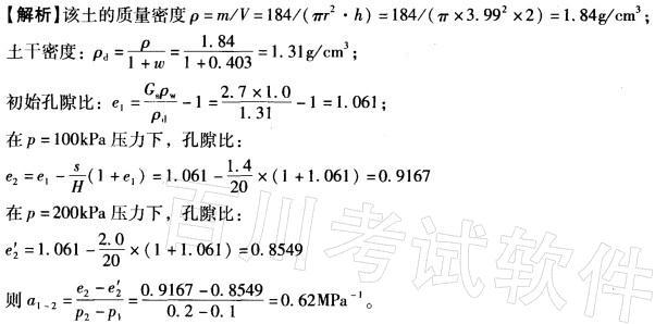 问题 用内径为79.8mm、高20mm的环刀切取未扰动饱和黏性土试样,比重Gs=2.70,含水量w=40.3%,湿土质量184g。现作侧限压缩试验,在压力100kPa和200kPa作用下,试样总压缩量分别为s1= 1.4mm和s2=2.0mm,其压缩系数a1-2( MPa-1)最接近下列哪个选项?( ) A. 0. 40 B. 0. 50 C. 0. 60 D. 0. 70