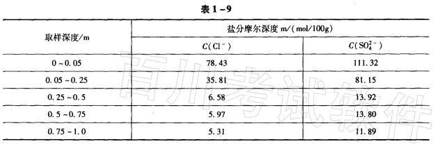 在一盐渍土地段,地表1.0m深度内分层取样,化验含盐成分如表1-9所示,按《岩土工程勘察规范》(GB 50021-2001)(2009年版)计算该深度范围...