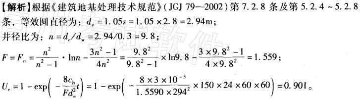 问题 某地基软黏土层厚18m,其下为砂层。土的水平向固结系数为ch=3.0×10-3cm/s2。现采用预压法固结,砂井做为竖向排水通道打穿至砂层,砂井直径为dw=0.3m,井距2.8m,按等边三角形布置,预压荷载为120kPa,在大面积预压荷载作用下按《建筑地基处理技术规范》(JGJ 79—2002)计算,预压150天时地基达到的固结度(为简化计算,不计竖向固结度)最接近( )。 A. 0.95 B. 0. 90 C. 0.85 D. 0. 80