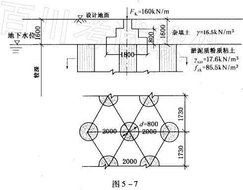 某条形基础上荷载标准值Fk=160kN/m,基础布置和地基上层断面如图5-7所示,基础的埋置深度d = 1.60m,采用振冲砂石桩置换法处理淤泥质粉质黏土...
