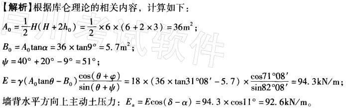 问题 高6m的建筑物路堤挡土墙,如图6-28所示。已知墙背倾角α=9°,墙后填土y= 18kN/m3,φ=40%,δ=20°,填土破裂角θ= 31°08′,填土表面水平且承受均布荷载(换算成土柱高h0=3m),用库仑理论求其墙背水平方向上主动土压力Ea的值为( ) kN/m。 A. 90.5 B. 91.8 C. 92.6 D. 96..4
