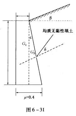 5m高的重力式挡土墙,尺寸如图6-31所示。已知墙体砌体重度yk=22kN/m3;墙背与竖直面的夹角ε= 10°,填土面的倾角β=10°,填土与墙体的摩擦...