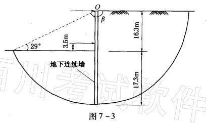问题 在饱和软黏土中基坑开挖采用地下连续墙支护,如图7-3所示,已知软土的十字板剪切试验的抗剪强度τ=34kPa;基坑开挖深度16.3m,墙底插入坑底以下的深度17.3m, 设有两道水平支撑,第一道支撑位于地面高程,第二道水平支撑距坑底3. 5m,每延米支撑的轴向力均为2970kN。沿着图示的以墙顶为圆心,以墙长为半径的圆弧整体滑动,若每延米的滑动力矩为154230kN·m,则其安全系数最接近于下面哪个选项的数值? ( ) A. 1.3 B. 1.0 C. 0.9 D. 0.6