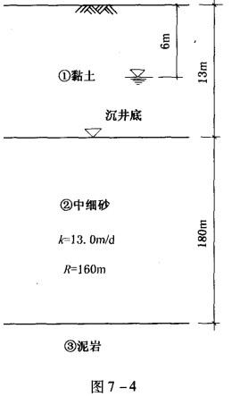 某场地地层情况如图7-4所示,场地第②层中承压水头在地面下6.0m。现需在该场地进行沉井施工,沉井直径20m,深13.0m(深度自地面算起)。拟采用设计单...