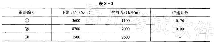 问题 某一滑动面为折线的均质滑坡,其计算参数如表8-2所示。取滑坡推力安全系数为1.05。试问滑坡③条块的剩余下滑力最接近下列哪个选项的数值?( ) A. 2140kN/m B. 2730kN/m C. 3220kN/m D. 3790kN/m