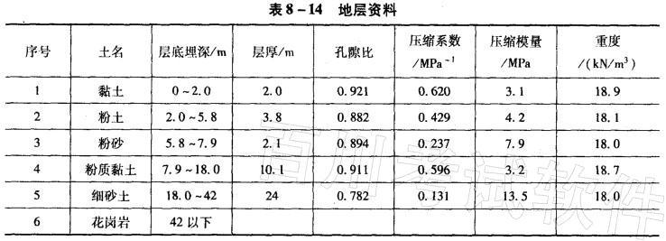 问题 某市地下水位埋深为1.5m,由于开采地下水,水位每年下降0.5m,20年后地下水位下降至11.5m,城市地层资料如表8-14所示。 20年后,地表最终沉降值为( )mm。 A. 450 B. 508 C. 550 D. 608