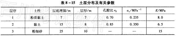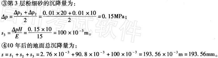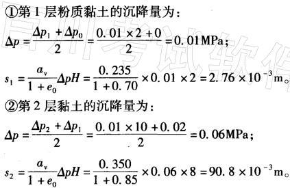 解析 黏土层和砂土层沉降量的计算公式分别为: 式中,s黏、s砂分别为黏土层和砂土层的最终沉降量(m);av为土层的压缩或回弹系数(MPa-1);Δp如为由于地下水位变化而施加于土层上的平均压力(MPa);H为计算土层的厚度(m);e0为土层原始孔隙比;E为砂土层的弹性模量(MPa)。地下水位每下降1m 所对应的水压力为1×103×10×1=104Pa=0.0.1MPa。用分层总和法进行计算,具体步骤如下:
