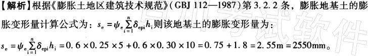问题 某膨胀土地基分为两层,已知第一层:h1=5m,εep1=25%,λs1=10%, Δw1=0.06;第二层:h2=10m,δep2=30%,λs2=15%,Δw2 =0.08;根据《膨胀土地区建筑技术规范》(GBJ 112-1987)中规定的计算公式: (2)取膨胀变形量的经验系数ψe=0.6,则该地基土的膨胀变形量为( )mm。 A. 2460 B. 2550 C. 2600 D. 2640